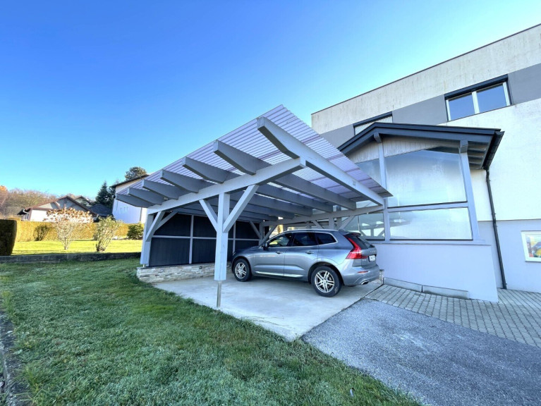*Das Doppelcarport mit angrenzendem überdachten Außentreppenaufgang mit Steinfliesen und dem Treppengeländer mit der Poolumrandung lässt Sie trockenen Fußes Ihre Einkäufe ausladen und geschützt vor Regen in Ihre Wohnräume gelangen.