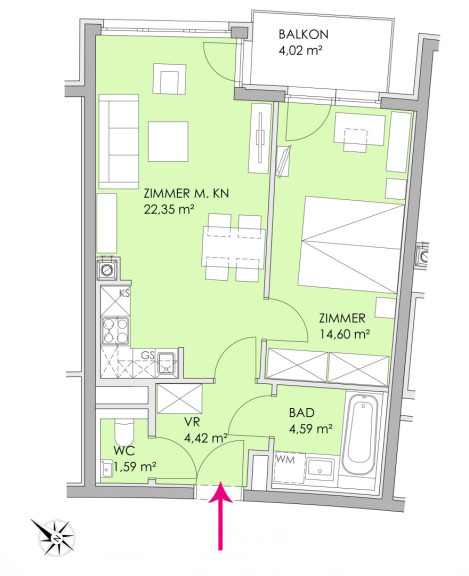 Die Wohnfläche von ca. 48 m² unterteilt sich in ein zentrales Vorzimmer, ein separates WC und ein Bad mit Wanne. Sehr attraktiv ist die moderne Wohnküche mit Einbaugeräten (E-Herd mit Kochfeld, Geschirrspüler, Kühl- Gefrierkombi) und Wohnbereich mit Ausgang auf den ostseitigen Balkon. Vom Schlafzimmer gibt es ebenfalls einen Ausgang auf den Balkon.