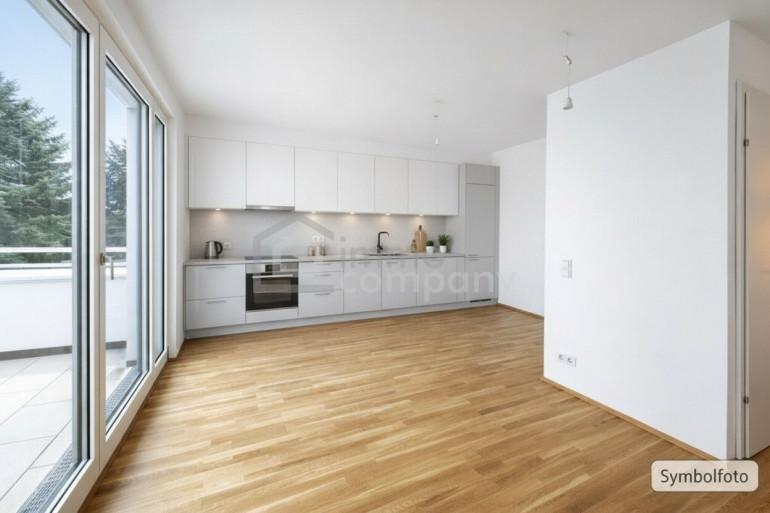 Der helle Wohnbereich mit integrierter Wohnküche bildet das Zentrum der Wohnung und bietet direkten Zugang zum Balkon. Große Fensterflächen sorgen für viel Tageslicht und schaffen eine angenehme Wohnatmosphäre.