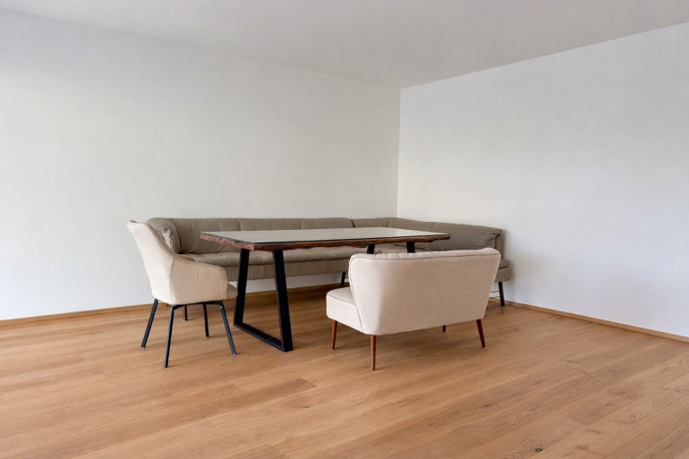 - Das Herzstück der Wohnung bildet der helle Wohn- und Essbereich mit offener Küche, bodentiefen Fenstern und direktem Zugang zur Terrasse.