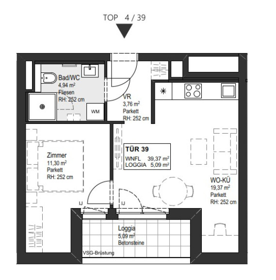 Fliesen, Parkett, Fußbodenheizung, Einbauküche, Ostbalkon, Dusche