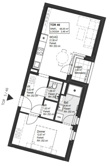 Parkett, Fliesen, Fußbodenheizung, Einbauküche, Ostbalkon, Dusche