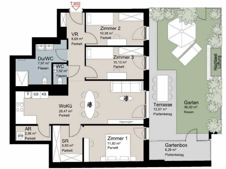 ObjektbeschreibungDiese westseitig orientierte 4-Zimmer-Gartenwohnung verfügt über einen direkten Gartenzugang von jedem Zimmer aus. Sie eignet sich ideal für Familien mit kleinen Kindern oder für Paare, die separate Räume für Homeoffice benötigen.