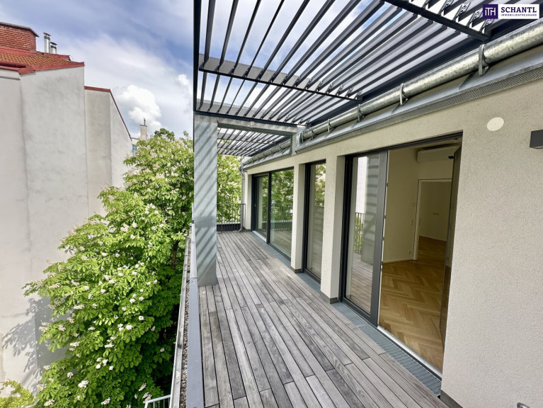 Wenn Sie nach unten schauen, liegt Ihnen die Stadt zu Füßen. Kopf hoch, und der Himmel über Wien ist zum Greifen nah. Genau so und nicht anders präsentiert sich dieses wunderbar angelegte Dachgeschoss mit all seinen Freiflächen. Hereinspaziert durch den einladenden Vorraum, mit viel Platz für Ihre Garderobe. Zur rechten Hand finden Sie das geräumige master bedroom mit en suite Badezimmer, ausgestattet mit Dusche, WC und Fenster, sowie den gemütlichen Lounge Bereich der Wohnung. Links rum erwartet Sie ein weiteres ca. 12 m² großes Schlafzimmer, ein zweites Badezimmer mit Dusche und das Gäste WC mit Handwaschbecken. Viel Platz für gemütliche Abende mit der Familie und Freunden finden Sie in dem etwa 37 Quadratmeter großen Koch- Essbereich. Ein großzügig integrierter Küchenbereich lässt die Herzen von Hobbyköchen mit Sicherheit höher schlagen. Vom Essbereich aus, gelangen Sie auf die 17 m² große Terrasse in Richtung Westen und all seinen begrünten Fassaden und Bäumen ringsum. Eine zweite, windgeschützte Terrasse komplettiert diese perfekte Wohnung im Erstbezug. So wohnt man gerne!