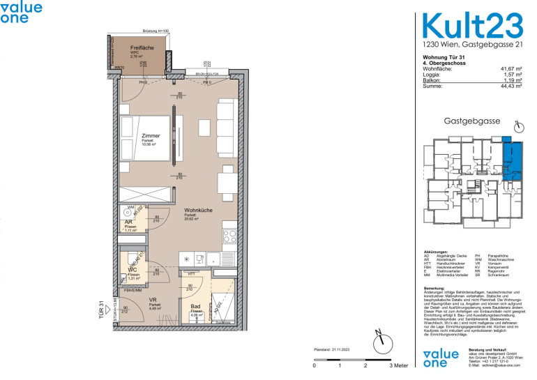 Zeitlos, elegant und funktional präsentiert sich das Kult23 im zukünftigen Kulturviertel von Liesing. Das moderne Wohnhaus mit 38 Apartments verteilt auf fünf Etagen und zwei Dachgeschosse steht für zeitgemäßen Lifestyle und Wohnkomfort. Die 39 bis 109 m2 großen Wohnungen mit ihren 2 bis 4 Zimmern verfügen über eigene Balkone, Terrassen oder Gärten. Der Gemeinschaftsgarten mit kleinem Spielplatz fördert den sozialen Austausch untereinander. Dort befindet sich auch ein separates Atelier, das ebenfalls erworben werden kann. Zusätzliches Plus sind die 23 Tiefgaragenplätze, die sich teilweise zum E-Parkplatz aufrüsten lassen.