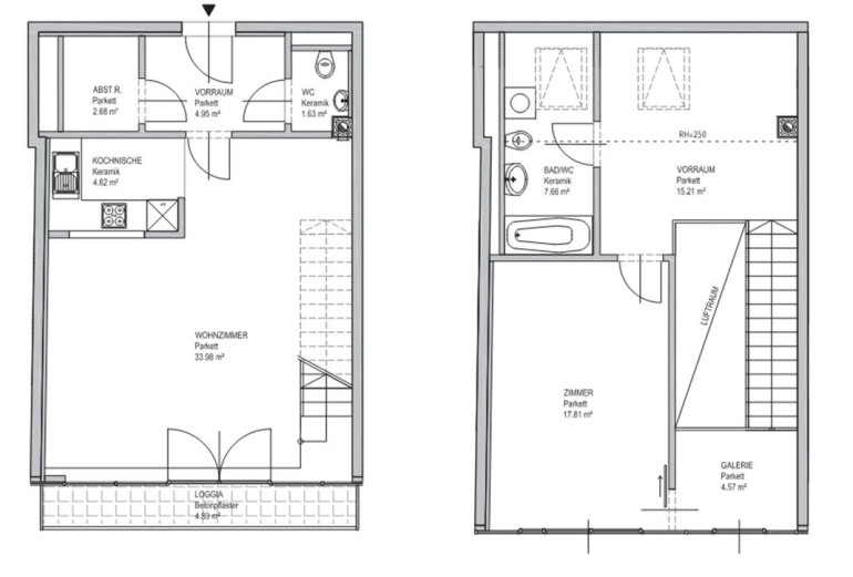 Vorzimmer, Wohnraum mit offener Küche, ca. 4,83 m2 Loggia, Schlafzimmer, Galerie, Badezimmer mit WC, separates WC, Abstellraum und Kellerabteil