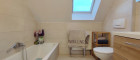 Im oberen Stock befinden sich zwei weitere ruhige Zimmer und ein stilvolles Badezimmer mit Badewanne, diesesund die Toilette wurden 2021 modernisiert.