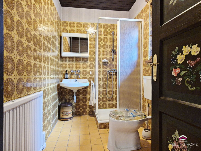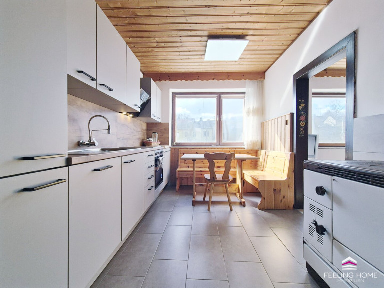 Fliesen, Laminatboden, Elektro, Heizofen, Einbauküche, Bad mit Fenster, Dusche
