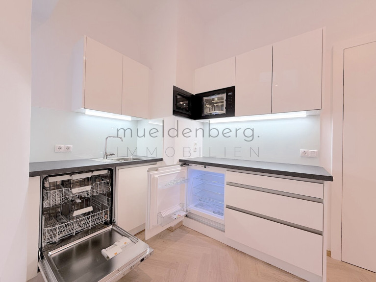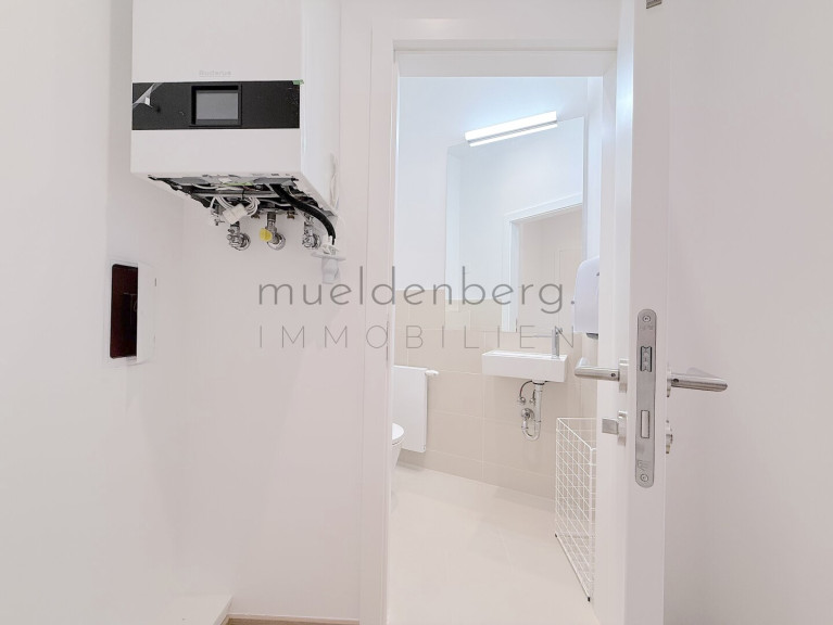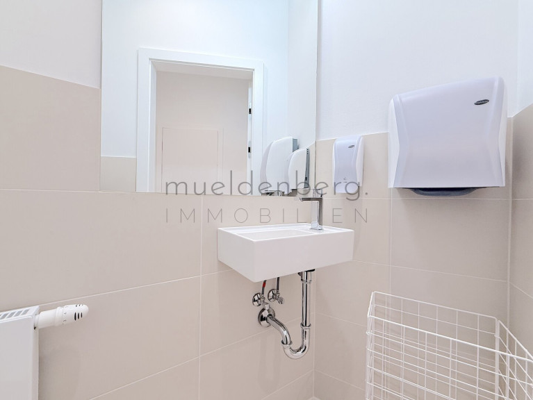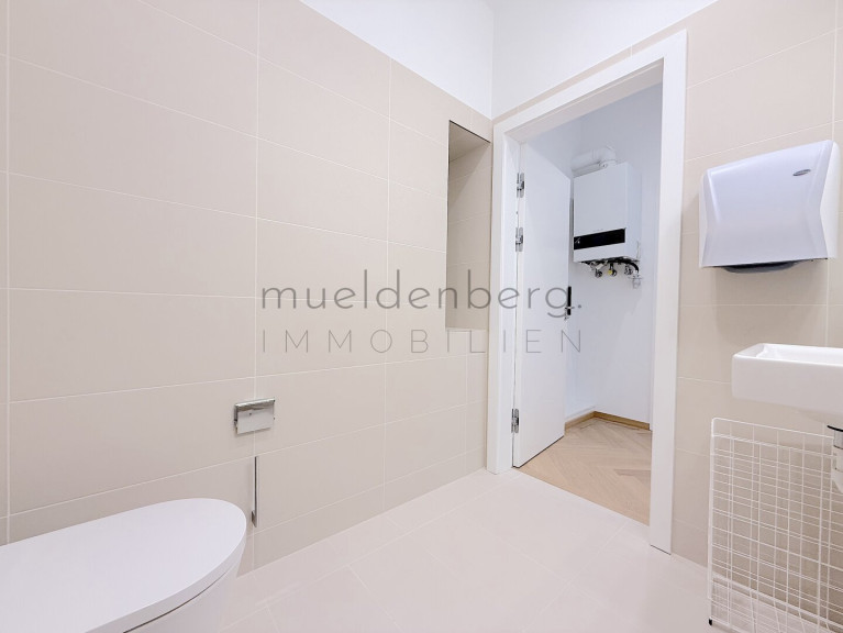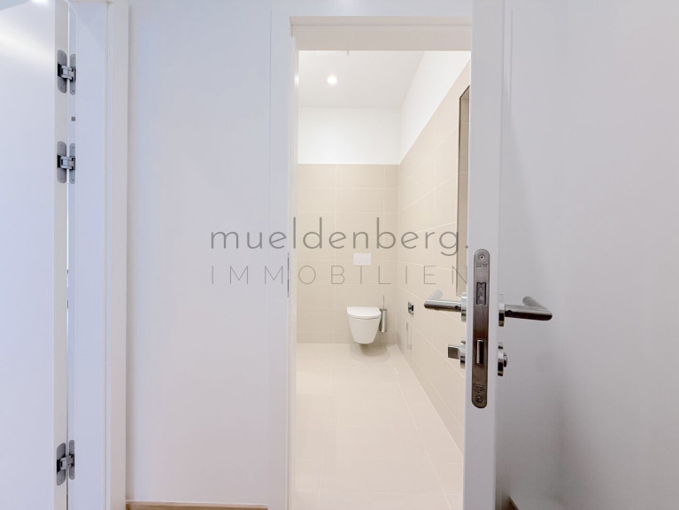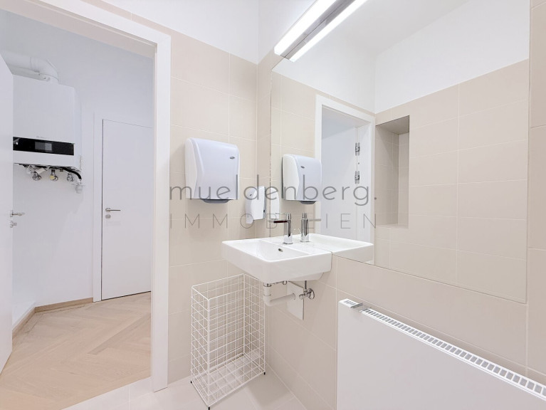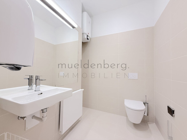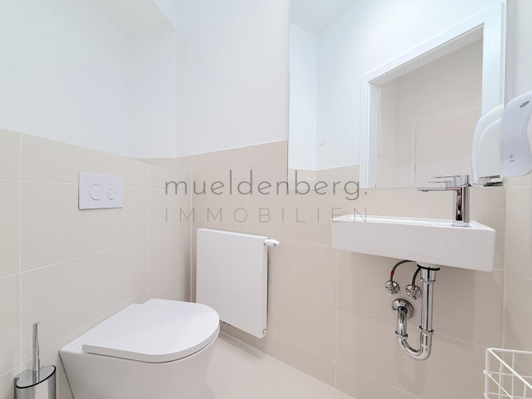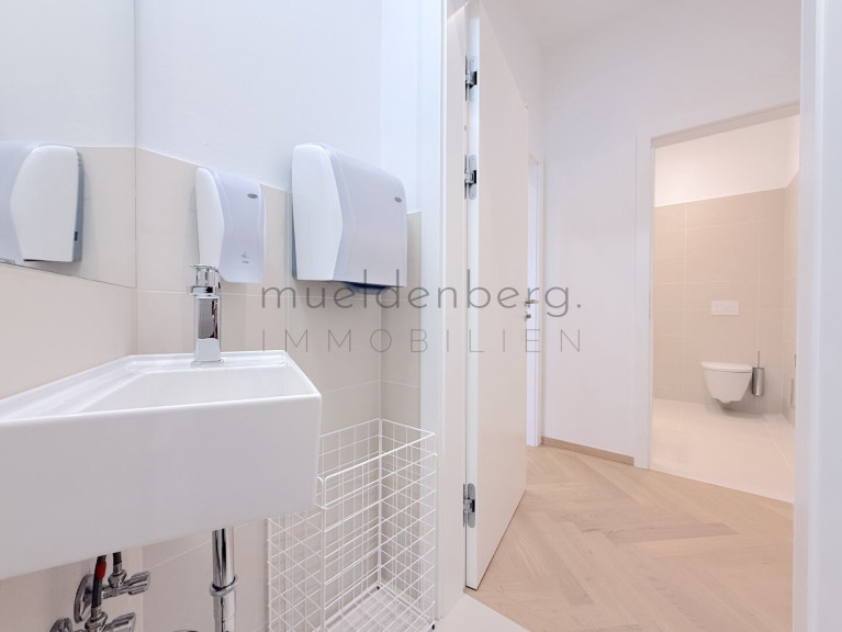 Zwei getrennte WCs erhöhen den Komfort und die Funktionalität dieser Bürofläche maßgeblich. Die Kombination aus hochwertigen Fliesen und elegantem Parkett unterstreicht den stilvollen Charakter der Räume. Eine moderne Einbauküche steht Ihnen zur Verfügung, um sich und Ihr Team optimal zu versorgen.