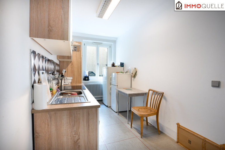 Über eine interne Treppe ist das Erdgeschoss direkt mit dem Obergeschoss verbunden. Hier befindet sich eine weitläufige Fläche, die aktuell als Büro- und Nebenfläche genutzt wird. Die Aufteilung umfasst mehrere Bereiche inklusive Küche, Lagerraum, Bürofläche, WC sowie Abstellraum. Diese Struktur ermöglicht eine flexible Nutzung und schafft funktionale Ergänzungsflächen zur Geschäftszone im Erdgeschoss.