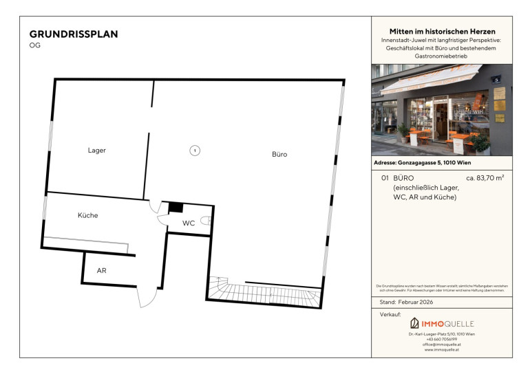 Lage? Die Immobilie befindet sich an der Ecke Gonzagagasse 5 und Salztorgasse 3. Die Umgebung ist geprägt von historischer Architektur, renommierten Büros und gehobenen Wohnadressen. Die unmittelbare Nähe zum Donaukanal sowie zu den kulturellen Zentren der Wiener Innenstadt macht diesen Standort besonders attraktiv. Die öffentliche Anbindung ist ausgezeichnet: Die U-Bahn-Station Schottenring (U2, U4) ist in wenigen Gehminuten erreichbar, ergänzt durch mehrere Straßenbahn- und Buslinien. Die hervorragende Erreichbarkeit stellt einen wesentlichen Standortvorteil für ein Geschäftslokal dar. Das urbane Umfeld mit einer Vielzahl an Handelsbetrieben, Gastronomie und Dienstleistungen sichert eine nachhaltige Frequenz und unterstreicht die wirtschaftliche Attraktivität dieser Lage.