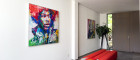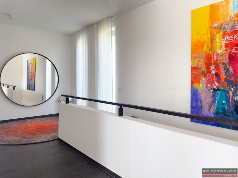 Im Erdgeschoss empfängt ein großzügiger Eingangsbereich mit Garderobe und maßgefertigtem Schrankverbau. Eine offene Galerie mit stilvoller Bibliothek schaffen ein besonderes Raumgefühl. Zwei Schlafzimmer – jeweils mit eigenem Bad – eines davon mit eigenem Schrankraum bieten viel Privatsphäre.