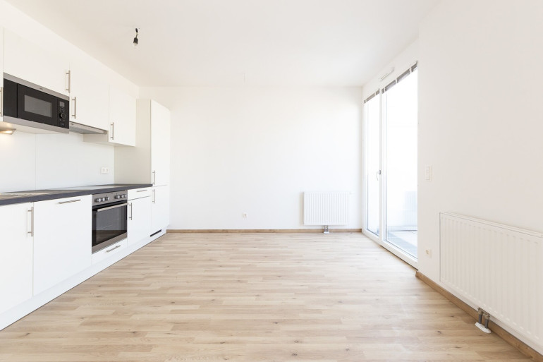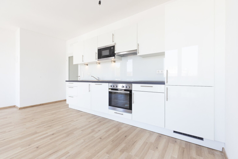 Wohnzimmer mit offener Einbauküche, Schlafzimmer, Vorzimmer,