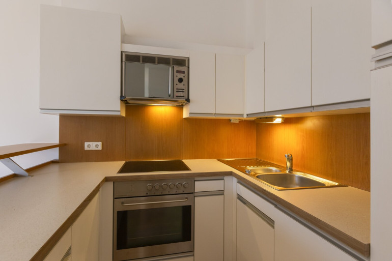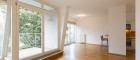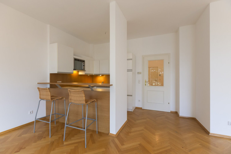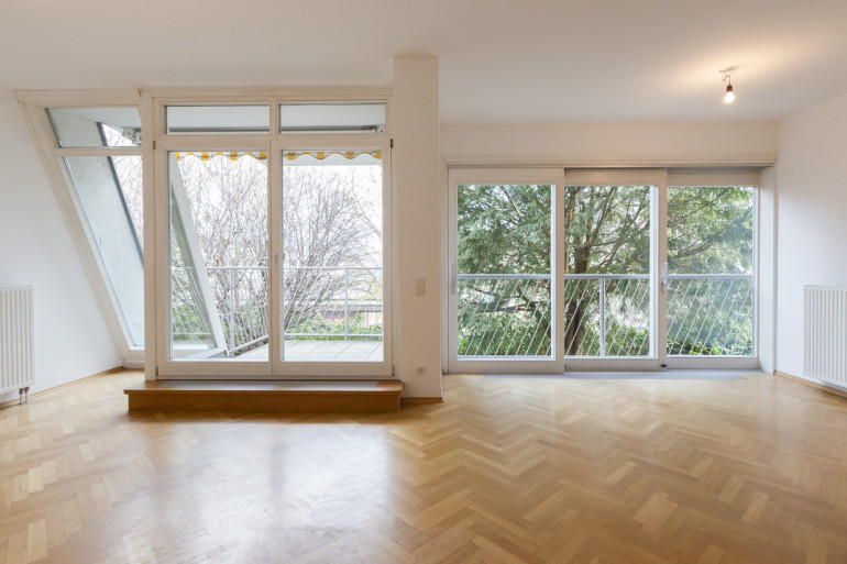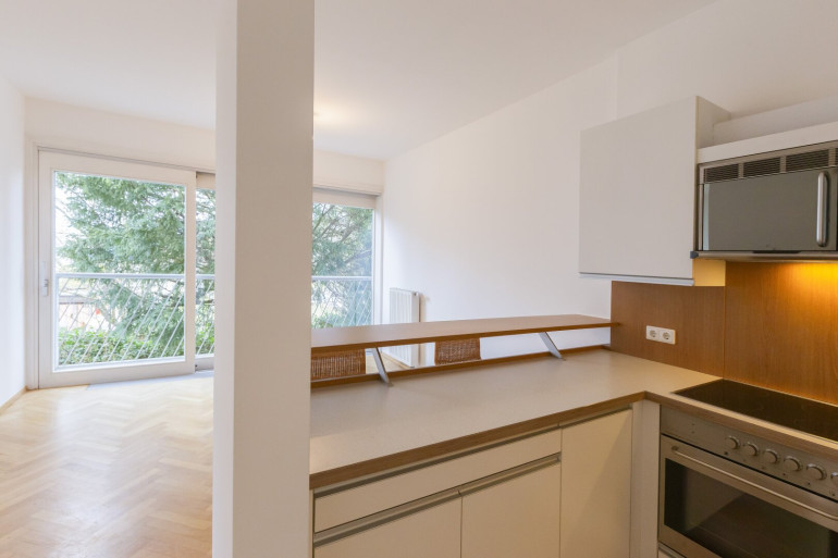 Wohnzimmer mit offener Küche und Zugang zum 1. Balkon, Schlafzimmer mit Zugang zum 2. Balkon, Arbeitszimmer, zentrales Vorzimmer,