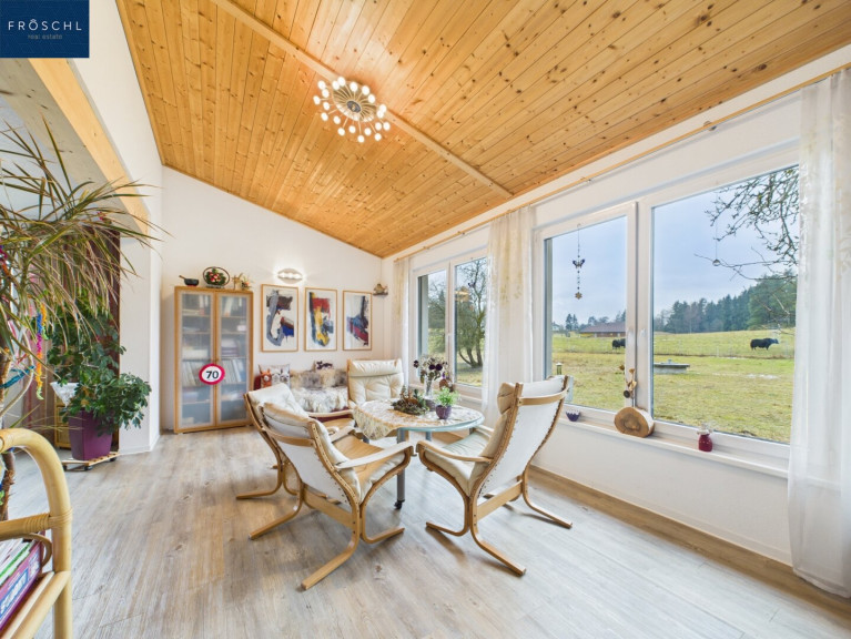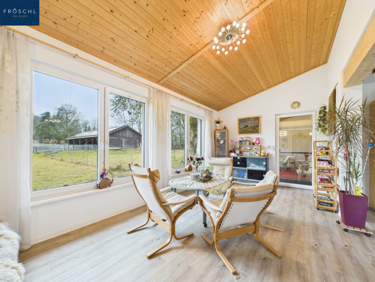 Das Herzstück der Liegenschaft bildet das großzügige Hauptwohnhaus im Erdgeschoss. Eine einladende Diele empfängt den Besucher und erschließt alle Räumlichkeiten des Hauses. Das weitläufige Wohn- und Esszimmer mit offener Küche und direktem Zugang zum Wintergarten schafft ein Raumgefühl, das Wärme und Großzügigkeit gleichermaßen vermittelt. Der lichtdurchflutete Wintergarten bietet das ganze Jahr über einen ungehinderten Blick in die unberührte Waldviertler Natur. Zwei Schlafzimmer sowie ein vollausgestattetes Badezimmer mit Badewanne, Dusche und Bidet sorgen für Rückzug und Komfort; die hauseigene Sauna lädt nach einem langen Tag zur wohlverdienten Entspannung ein. Über eine Terrasse mit Loggia in südöstlicher Ausrichtung gelangt man direkt ins Freie. Böden in Fliesen, Laminat und Parkett sowie Mehrfachverglasung und kontrollierte Wohnraumlüftung unterstreichen den gehobenen Ausstattungsstandard.