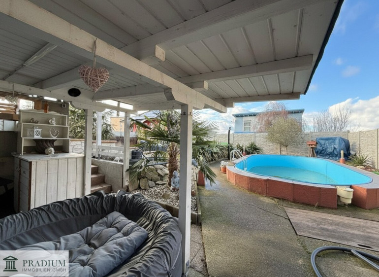 Das 550 m² große Grundstück ist eben und rechteckig geschnitten. Der Garten eröffnet Freiraum für Entspannung, Spiel oder kreative Gestaltungsideen. Die Terrasse erweitert den Wohnbereich ins Freie und schafft einen idealen Platz für sonnige Stunden. Ein Pool sowie ein Carport sind ebenfalls vorhanden.