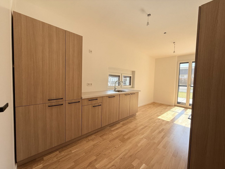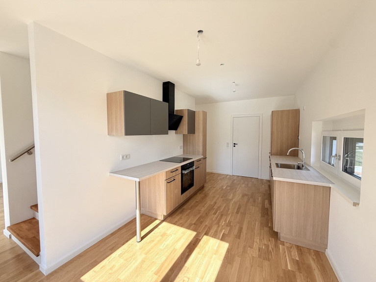 Im Erdgeschoss befindet sich ein heller, zentraler Wohnbereich mit direktem Zugang zur Terrasse und in den Garten. Die offene Küche ist harmonisch in den Wohnraum integriert. Zusätzlich gibt es einen Vorraum, eine Garderobe, ein separates WC sowie einen Technikraum und eine praktische Speisekammer.