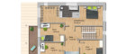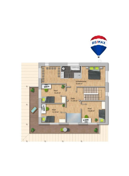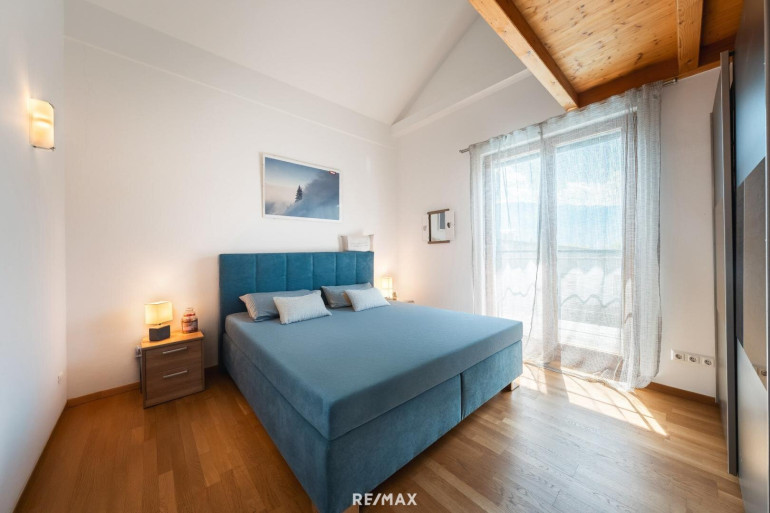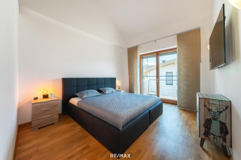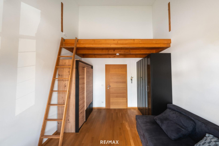 Das Obergeschoß bietet Raum für die ganze Familie: Ein besonders großzügiges Elternschlafzimmer mit eigenem Bad und begehbarem Ankleidebereich sorgt für Privatsphäre und Komfort. Drei weitere Schlafzimmer verfügen jeweils über eine zusätzliche Ebene im darüberliegenden Dachgeschoß – ideal als Spiel-, Lern- oder Ruhebereich für Kinder und Jugendliche. Der helle Flur verbindet alle Räume zu einem durchdachten Gesamtbild.