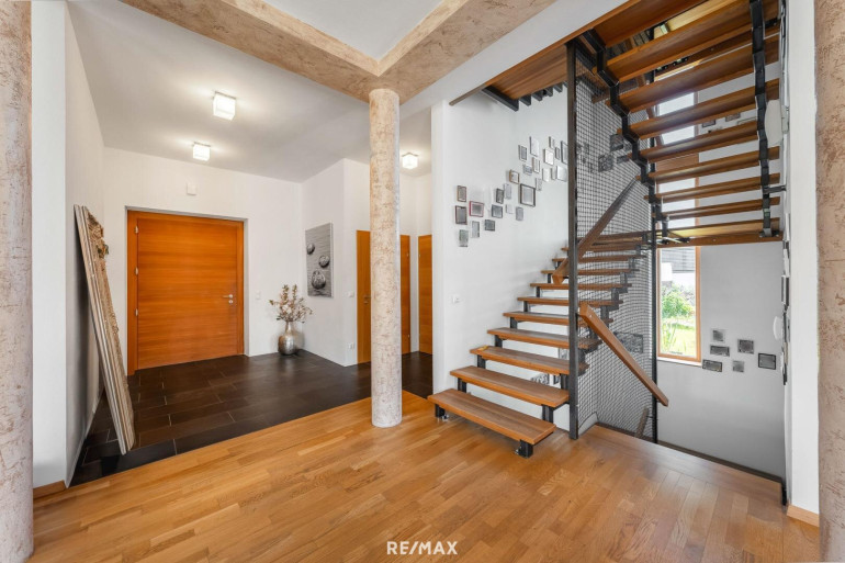 Im Erdgeschoß erwartet Sie ein offener Wohn- und Eingangsbereich mit beeindruckender Raumhöhe von 3,20 Metern. Die Kombination aus natürlichem Licht, stilvollem Interieur und harmonischem Design schafft ein einladendes Wohngefühl. Ergänzt wird das Erdgeschoß durch ein elegantes Badezimmer sowie ein separates WC – ideal für den Alltag und Besuch.