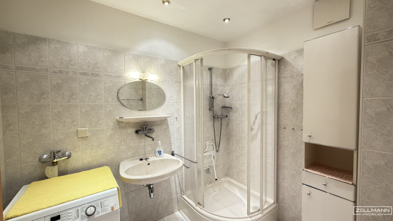 Badezimmer mit Dusche und Waschmaschinenanschluss