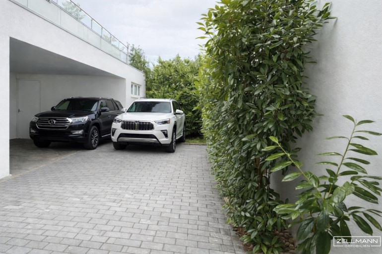 Die Zufahrt erfolgt komfortabel über ein automatisches Garagentor, das diskrete und sichere Erreichbarkeit gewährleistet.