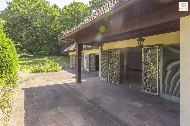 Eingebettet in die wunderschöne Natur mit einem Hauch von mediterranem Flair bietet dieses einzigartige Anwesen einen unverbaubaren Panoramablick über eine private, uneinsichtige, 6.000 m² große Parklandschaft.