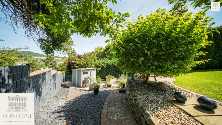 Der 960 m² große Garten ist ein wahres Paradies und ein Meisterwerk der Gartengestaltung. Auf verschiedenen Ebenen angelegt, eröffnet sich hier eine Welt der Ruhe und Schönheit. Liebevoll gepflegte Ziersträucher und kunstvoll angelegte Details machen jeden Spaziergang zu einem Erlebnis. Stellen Sie sich vor, wie Sie morgens mit einer Tasse Kaffee auf einer der Terrassen sitzen und die ersten Sonnenstrahlen genießen, während Sie die frische Luft einatmen und die Vögel zwitschern hören.
