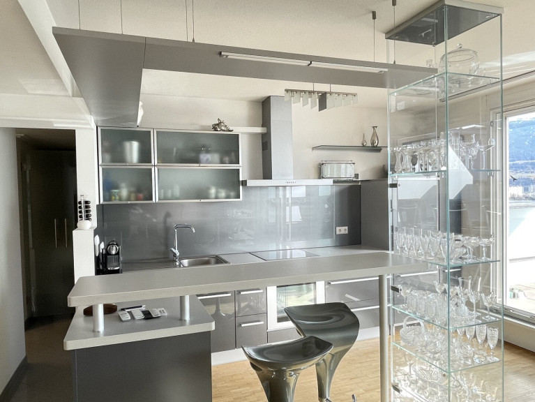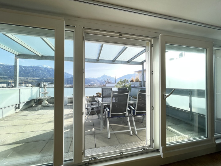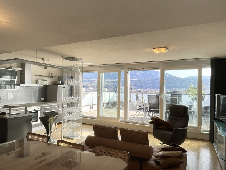 Die obere Ebene bildet die eigentliche Penthouse-Ebene und den zentralen Lebensmittelpunkt. Hier befindet sich die großzügige Wohnküche mit offenem, repräsentativem Wohnbereich und direktem Zugang zur rund 32 m² großen, südlich ausgerichteten Dachterrasse. Die Terrasse ist unverbaubar und bietet einen beeindruckenden Panorama-Ausblick mit Stadtblick, Blick auf die umliegende Bergwelt sowie über das Inntal. Die Südausrichtung gewährleistet eine ausgezeichnete Besonnung über weite Teile des Tages. Der Außenbereich wird durch eine elektrische Markise sowie separat steuerbare Beschattungselemente ergänzt und ist dadurch flexibel und komfortabel nutzbar.