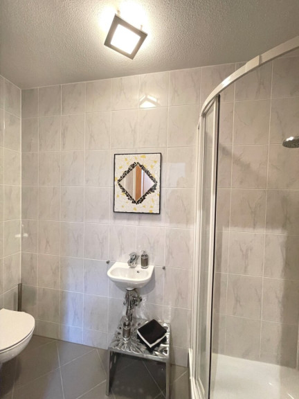 Ebenfalls im oberen Geschoß befinden sich ein Schlafzimmer, ein Badezimmer mit Badewanne und Tageslichtfenster sowie ein separater Stauraum bzw. eine Waschküche, funktional vom Wohnbereich getrennt und ideal in den Alltag integriert.