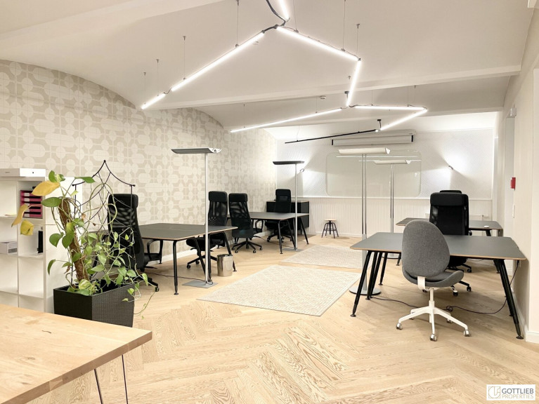 Das Büro befindet sich im Erdgeschoss in den ruhigen Innenhof gerichtet und beinhaltet zwei getrennt begehbare Bürozimmer inklusive Besprechungsraum, eine Küche, eine Toilette sowie eine kleine Terrasse. Der Innenhof ist direkt vom loftartigen Bürozimmer aus begehbar.