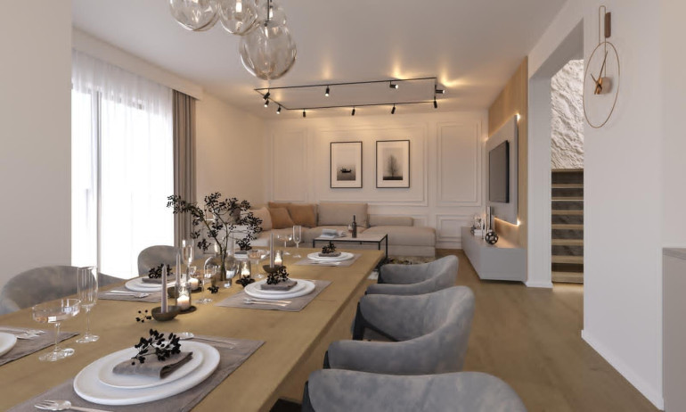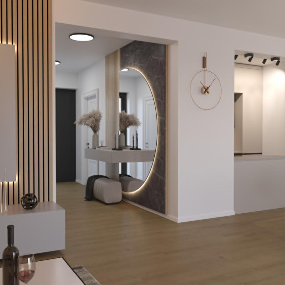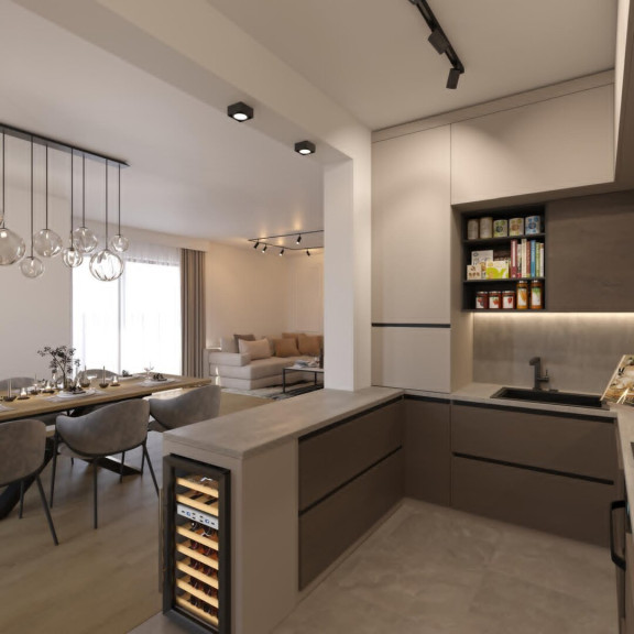 Die offen integrierte Küche fügt sich harmonisch in den Wohnbereich ein und wird zum stilvollen Mittelpunkt für Genuss, Geselligkeit und Alltag.