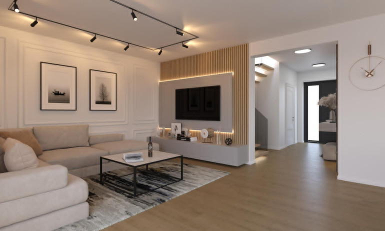 Bereits beim Betreten des Hauses spürt man die Großzügigkeit und Klarheit des durchdachten Grundrisses. Das elegante Herzstück bildet der offen gestaltete Wohn- und Essbereich mit ca. 40,9 m², der durch großzügige Fensterflächen lichtdurchflutet ist und einen fließenden Übergang zur sonnigen Terrasse sowie zum ca. 91,48 m² großen Garten schafft. Hier verschmelzen Innen- und Außenraum zu einem modernen Wohngefühl voller Ruhe und Privatsphäre.