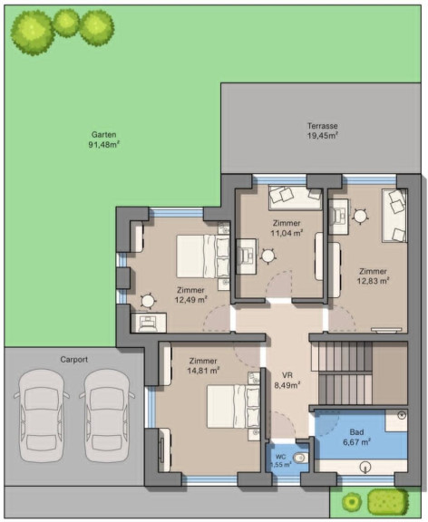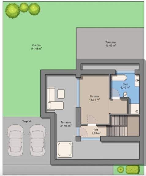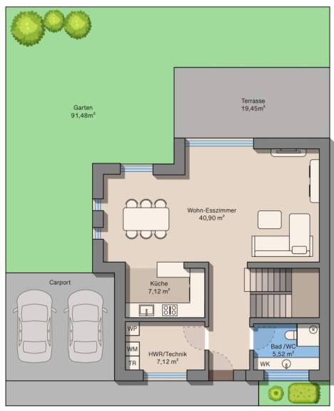 Der Carport mit zwei Stellplätzen rundet das Angebot ab und ermöglicht einen komfortablen, wettergeschützten Zugang zum Haus.