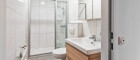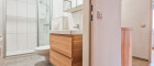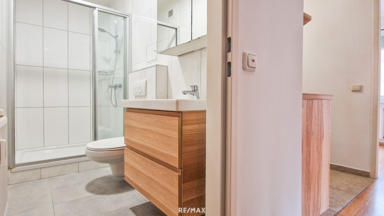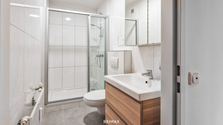 - Badezimmer mit großer Duschkabine, Waschtisch mit Spiegelschrank und WC