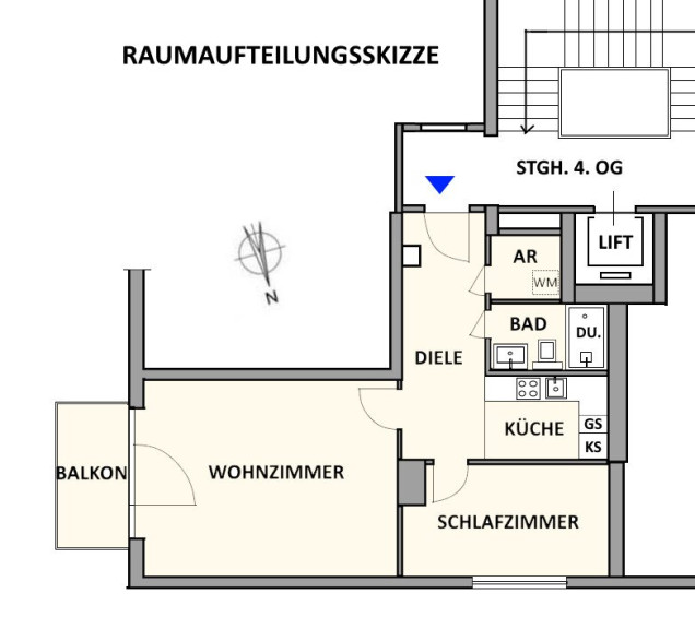 Die Wohnfläche beträgt ca. 44,00 m² (zzgl. Balkon) und ist wie folgt aufgeteilt: