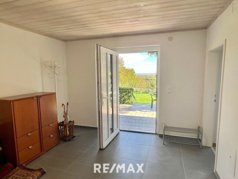 An die PKW-Garage angebaut befindet sich ein Raum zum Heimwerken mit hinterem Eingang.