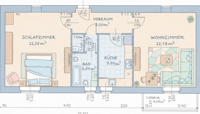 Der bestehende 2-Zimmer-Grundriss überzeugt durch klare, gut möblierbare Räume. Besonders attraktiv:
