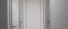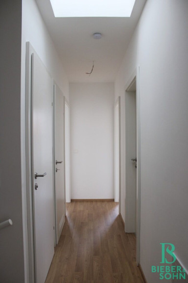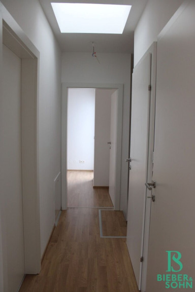 Die Nassräume, Abstellräume und der Eingangsbereich sind mit hochwertigen Fliesen und die Wohnräume mit eleganten Dekor Eiche Laminat ausgestattet.