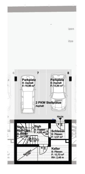 Jedem Reihenhaus sind ein Eigengarten und 2 PKW-Stellplätze in der unter den Reihenhäusern liegenden Tiefgarage zugeordnet.