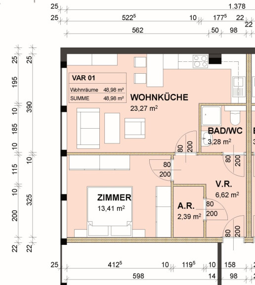 Die sehr gut aufgeteilte 49m²-Wohnung besteht aus: