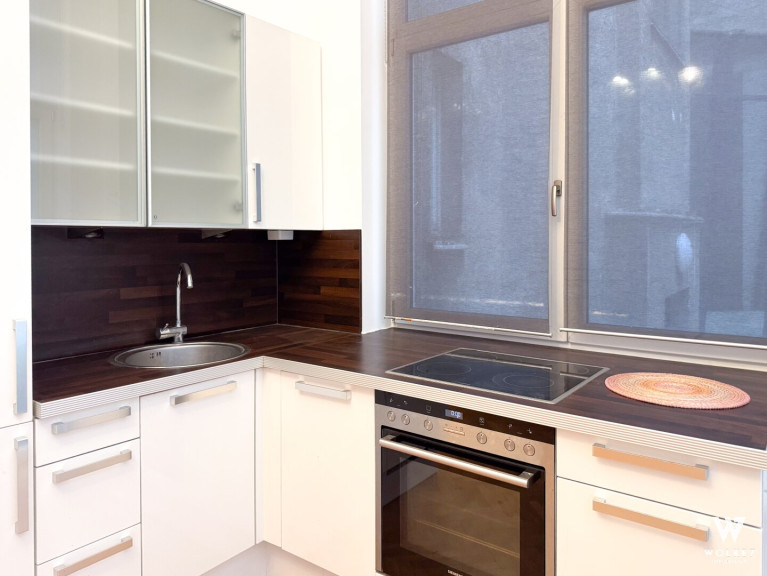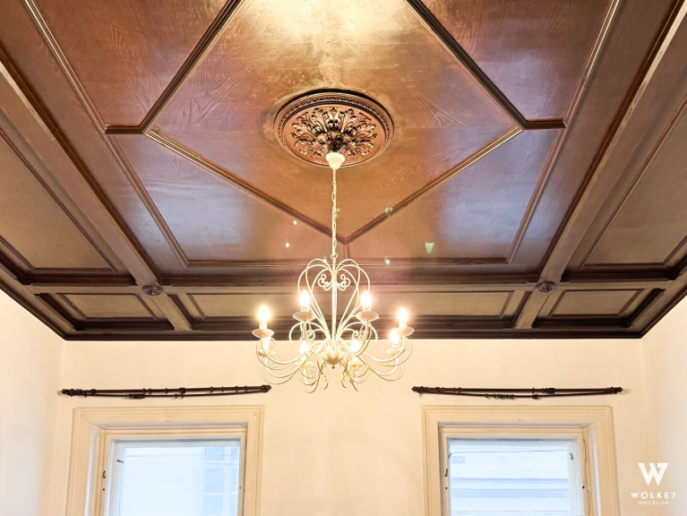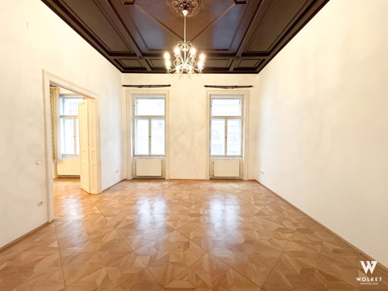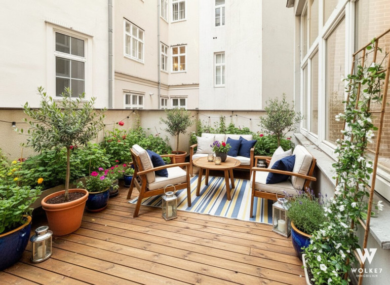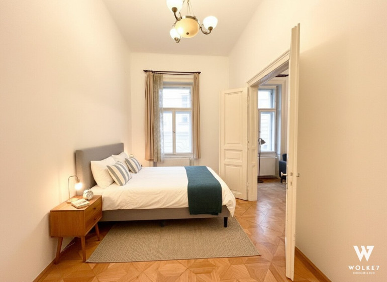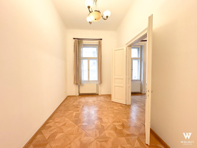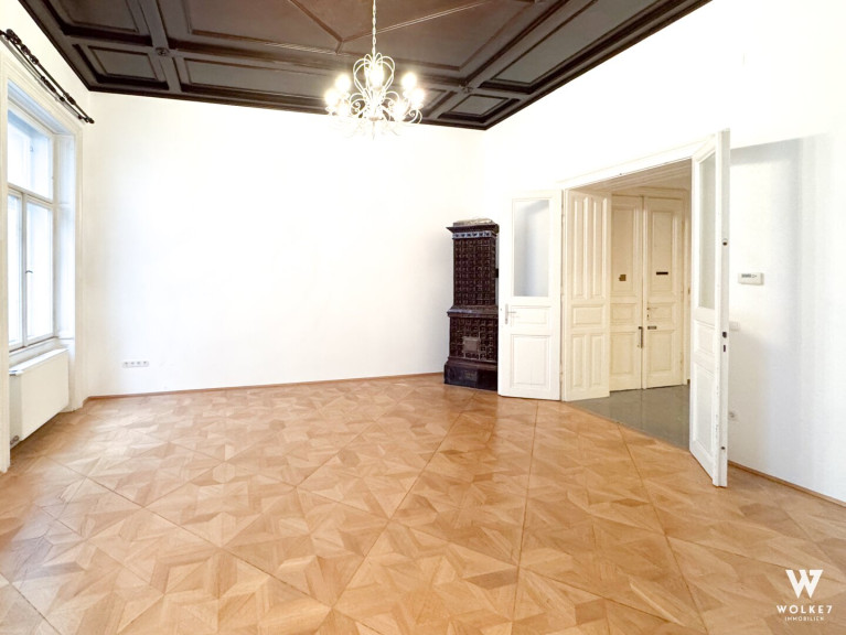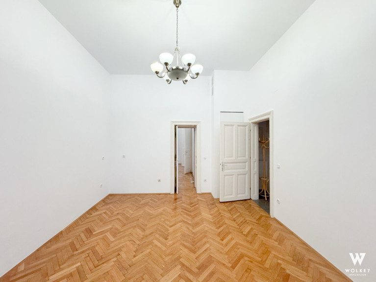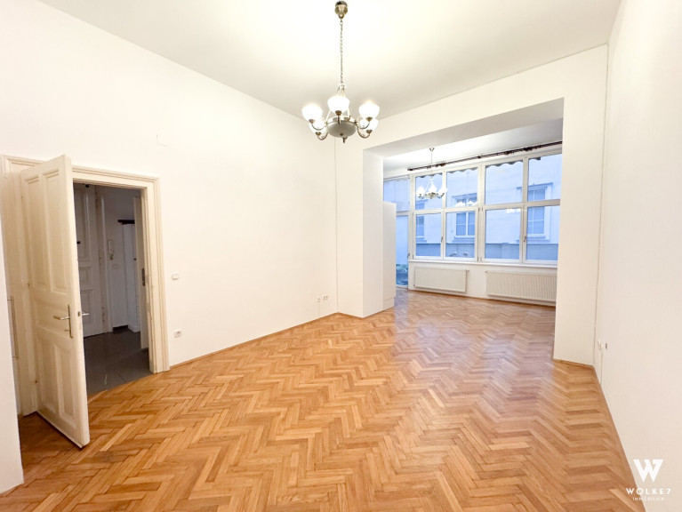 Bereits beim Betreten spürt man den Charakter dieser Wohnung: Raumhöhen von ca. 3,5 Metern, originales Parkett aus dem 20. Jahrhundert, klassische Flügeltüren sowie doppelflügelige Kastenfenster verleihen den Räumen Großzügigkeit und Eleganz. Alle Zimmer sind zentral vom Vorraum aus begehbar – ein klarer, funktionaler Grundriss ohne Durchgangszimmer. Die Wohnküche liegt ruhig hofseitig und bietet direkten Zugang zur Terrasse – ein geschützter Außenbereich mitten in der Stadt, ideal für entspannte Abende oder ein Frühstück im Freien. Die Küche ist geschickt im hinteren Teil des Raumes integriert und optisch vom Ess- und Wohnbereich getrennt.