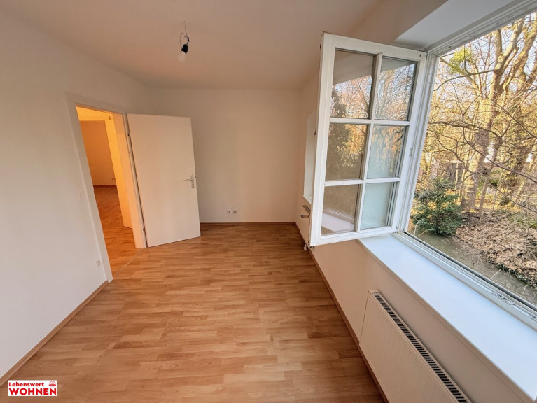 Schlafzimmer (ca. 12 m²) mit traumhaftem Bachblick – aufwachen mit Blick ins Grüne und dem sanften Klang des Wassers
