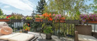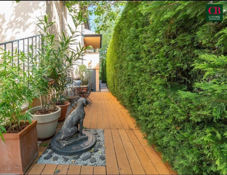 Der Außenbereich ist hochwertig gestaltet (Kombination aus PVC-Dielen und Natursteinplatten) und bietet automatische Bewässerung sowie Gartenbeleuchtung im gesamten Garten.
