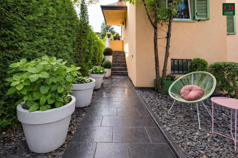 Eine etwa 20 Meter lange und rund 3 Meter hohe Zypressenhecke sorgt für ausgezeichneten Sichtschutz und Privatsphäre. Der Garten ist als geschützter Lounge-Bereich gestaltet und eignet sich ideal zum Entspannen oder für gesellige Abende im Freien.