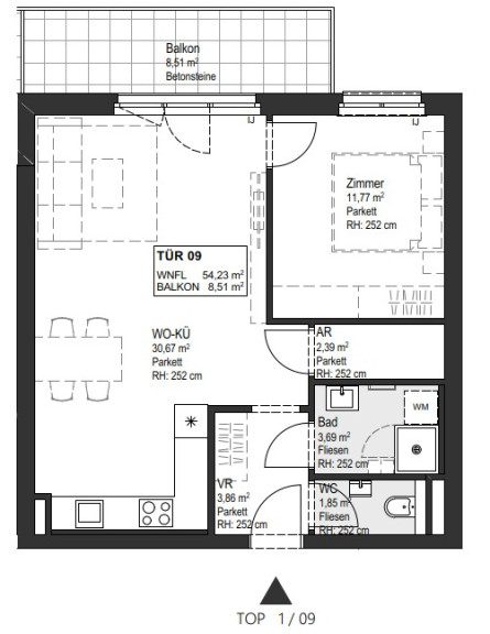 Parkett, Fliesen, Fußbodenheizung, Einbauküche, Westbalkon, Dusche