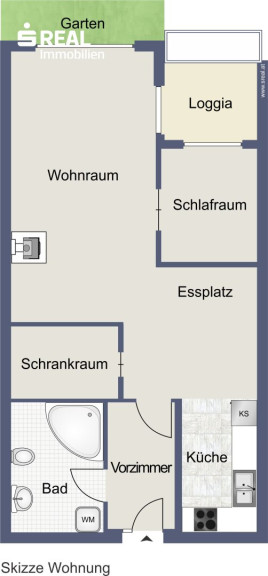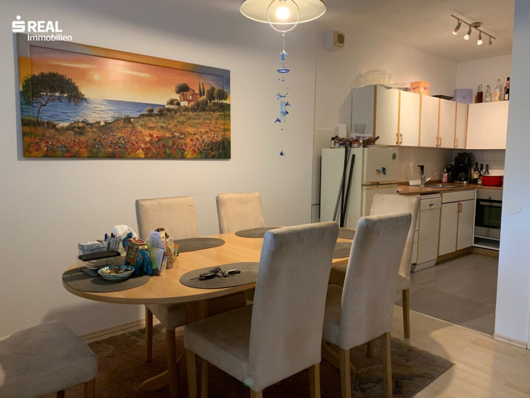Die Wohnung wird über den begrünten Innenhof betreten. Die Einheit besteht aus Vorraum, Wohnzimmer, Schlafzimmer, Schrankraum, möblierter Küche, möbliertem Bad, Toilette, Loggia und Kellerabteil.