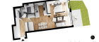 Der offen gestaltete Wohnbereich mit Küche in einer separaten Nische sorgt für kurze Wege und ein angenehmes Raumgefühl. Ein separates Schlafzimmer mit direktem Gartenzugang schafft eine ruhige Rückzugsoase. Getrenntes WC und Badezimmer bieten zusätzlichen Komfort.
