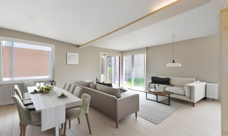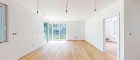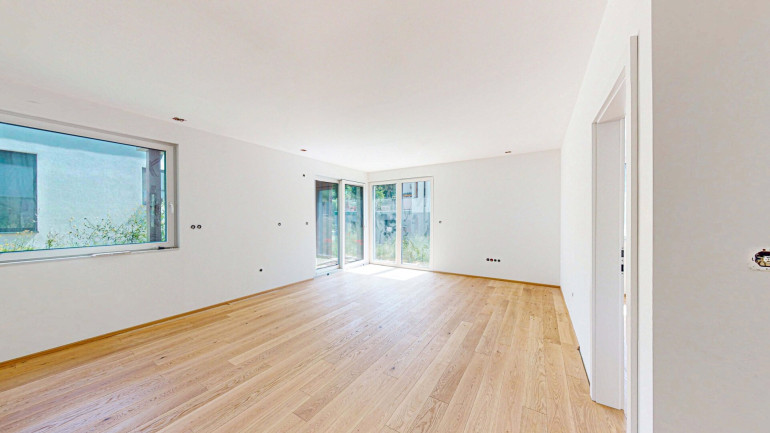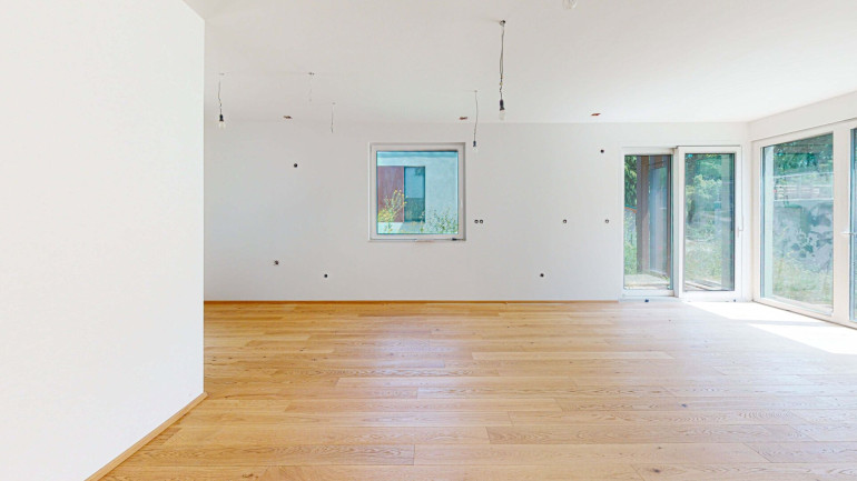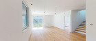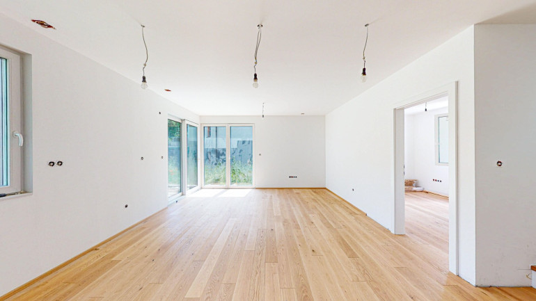 Offener Wohnraum im Erdgeschoss mit direktem Zugang zum Balkon