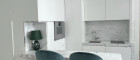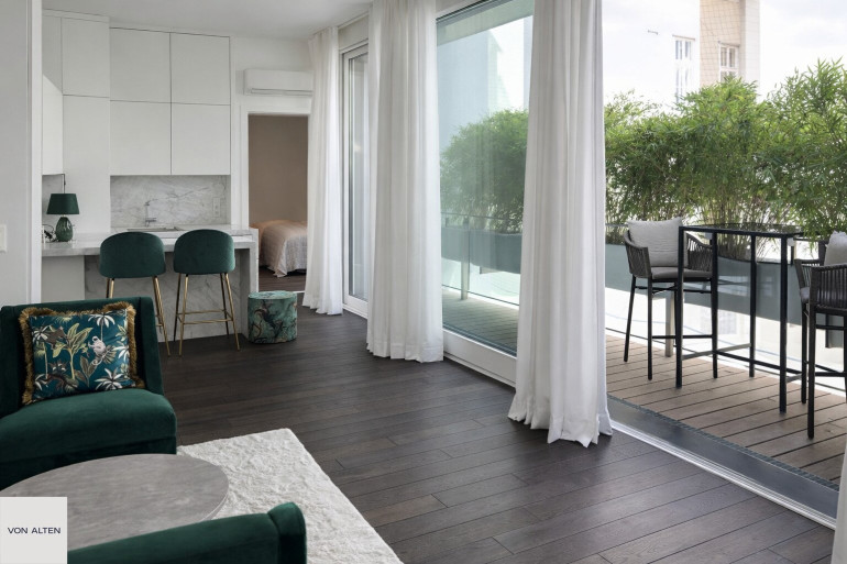 Der Wohn-Essbereich bildet das Herzstück der Wohnung. Hochwertiger dunkler Eichenparkett und maßgefertigte Einbaumöbel schaffen ein elegantes, zugleich wohnliches Ambiente. Die moderne Wohnküche ist funktional integriert und hochwertig ausgestattet.