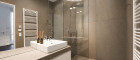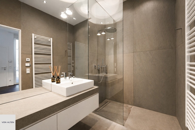 Das Badezimmer ist modern gestaltet und mit einer großzügigen Dusche ausgestattet. Ein separates WC ergänzt den durchdachten Grundriss. Außenjalousien, Klimatisierung sowie barrierefreier Zugang erhöhen den Wohnkomfort zusätzlich.